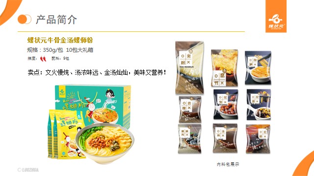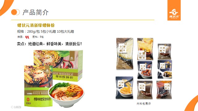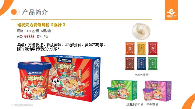螺状元食品主营销售预包装柳州螺蛳粉,主要款式有少女粉310g、金汤350g、清新绿180g等产品。螺状元以四川大学、柳州工学院等多所重点大学为技术依托、四川大学硕士生导师卢晓黎教授作为研发团队核心,结合市场对快消食品的需求,采用先进技术和设备,不断致力于产品质量与食品安全,以及产品创新研发,使用巴氏杀菌技术安全消杀,为广大消费者提供安全、美味、健康的正宗柳州螺蛳粉。螺状元拥有完整的产品质量检验体系和自主商标(螺状元),首批获得柳州螺蛳粉地理标志授权认证产品以及香港优质认证品牌的企业之一,获得出口备案资质,以及ISO9001、22000,HACCP质量认证。也是柳州市首家预包装螺蛳粉出口海外的品牌,产品国内线下与沃尔玛、大润发、永辉等大型商超,线上与淘宝、京东、唯品会等平台合作,我司是第一家自营出口的企业,产品远销英国、法国、加拿大、澳大利亚等全世界20个国家。