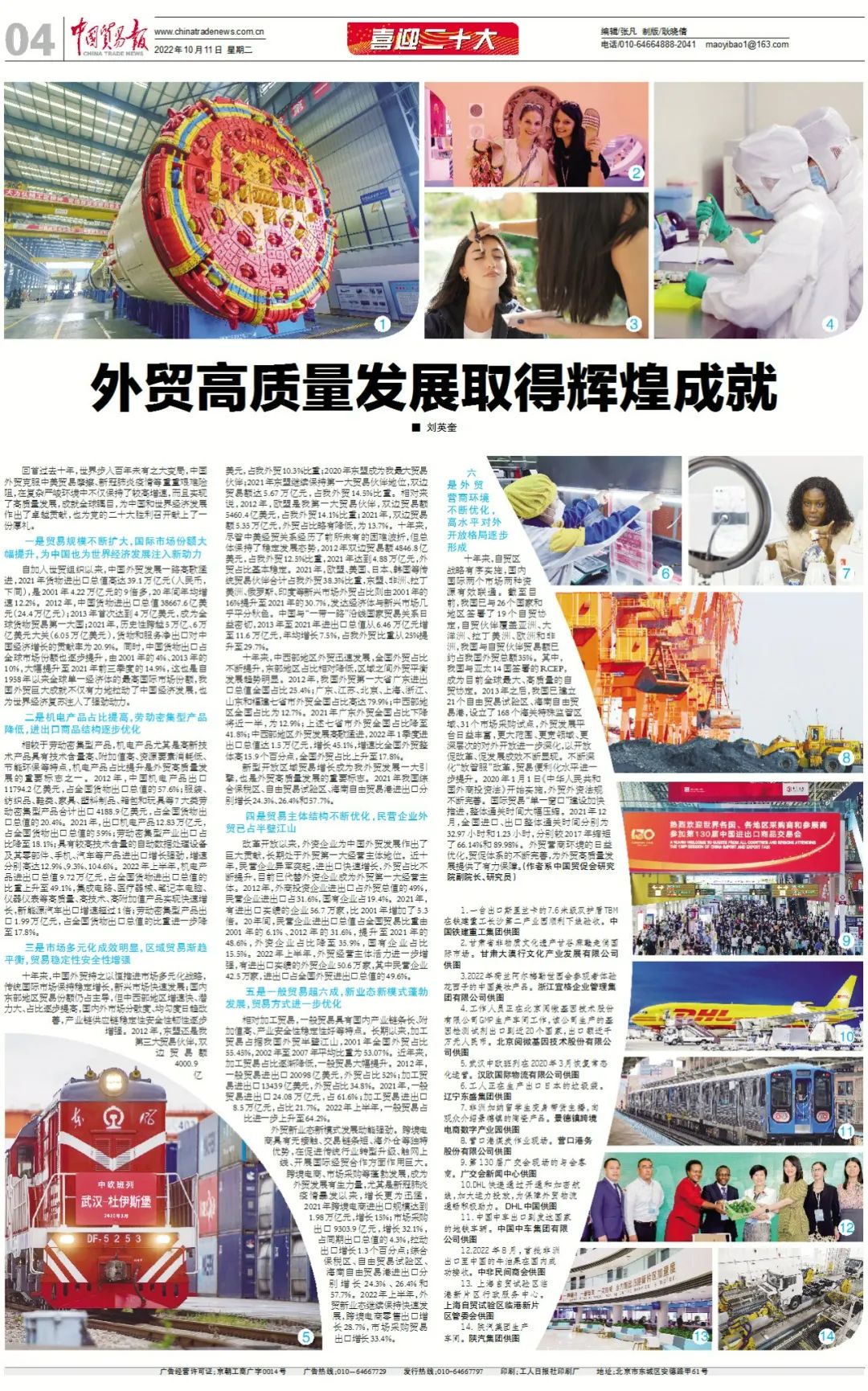回首过去十年,世界步入百年未有之大变局,中国外贸克服中美贸易摩擦、新冠肺炎疫情等重重艰难险阻,在复杂严峻环境中不仅保持了较高增速,而且实现了高质量发展,成就全球瞩目,为中国和世界经济发展作出了卓越贡献,也为党的二十大胜利召开献上了一份厚礼。